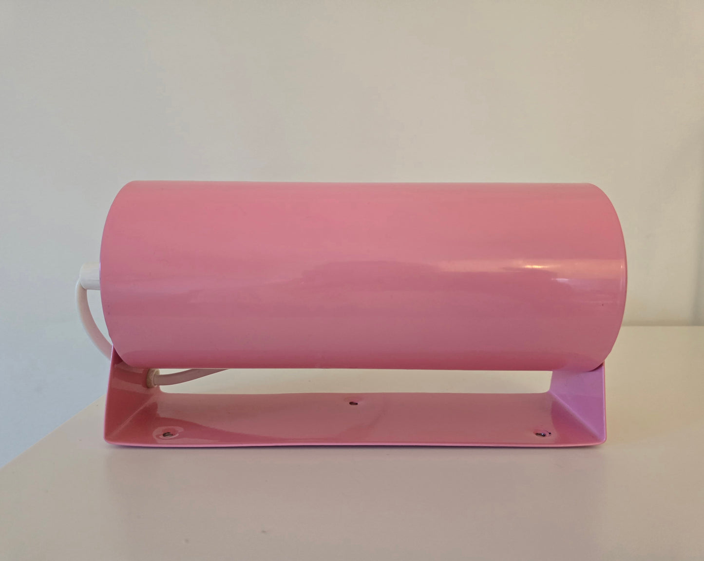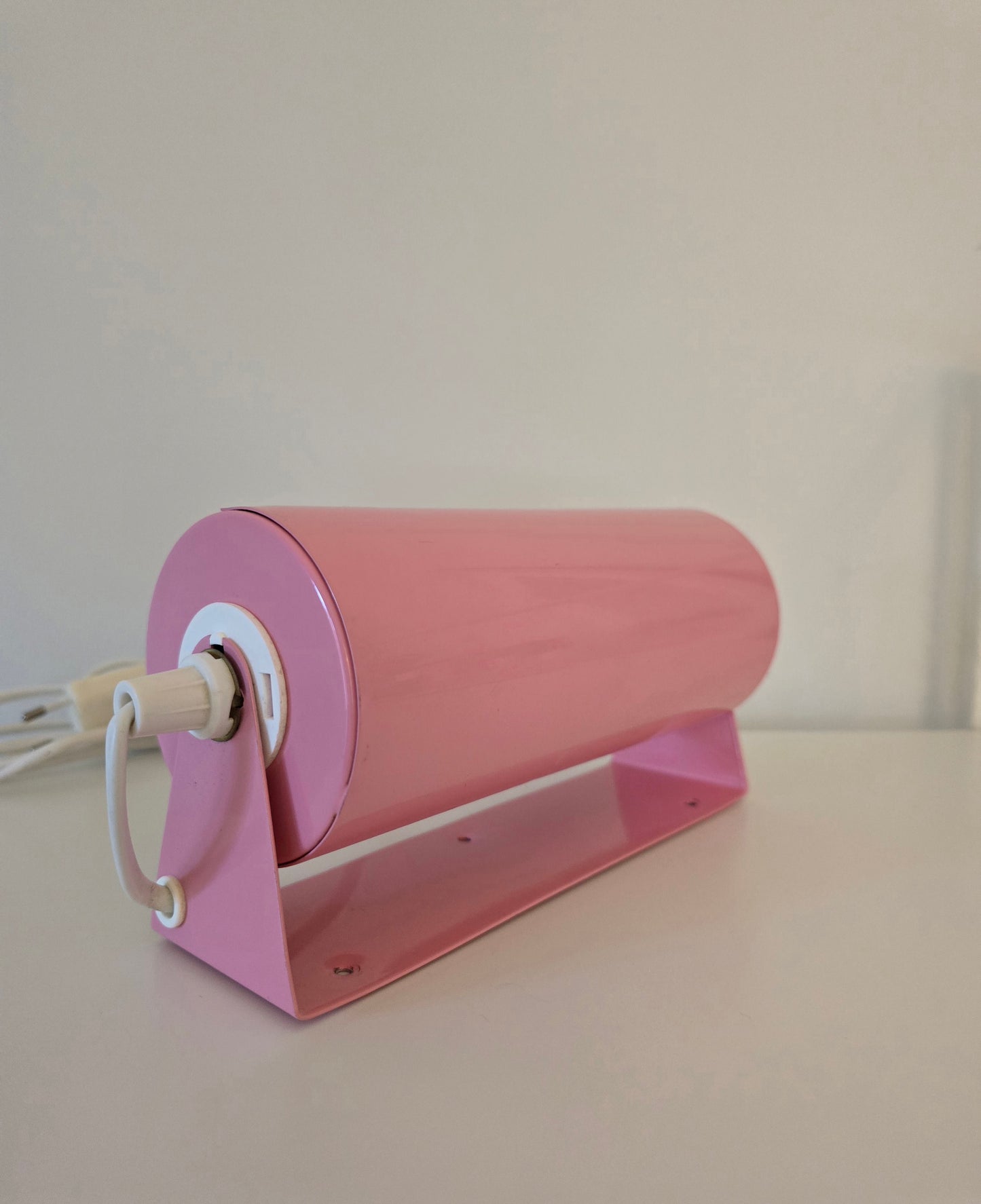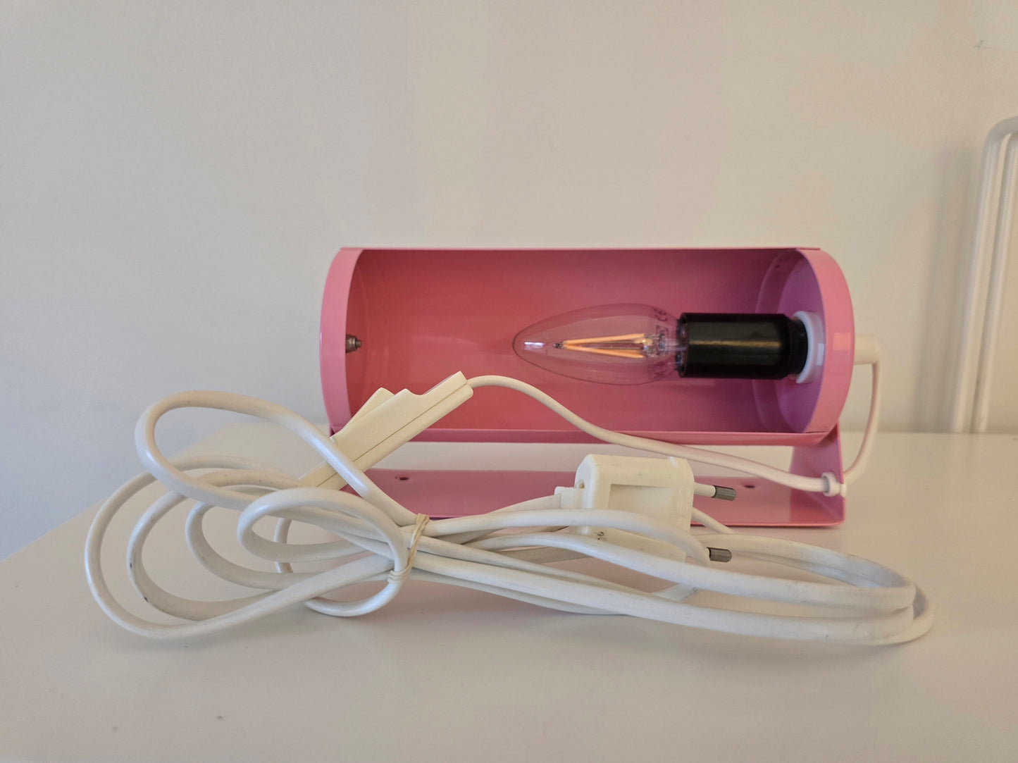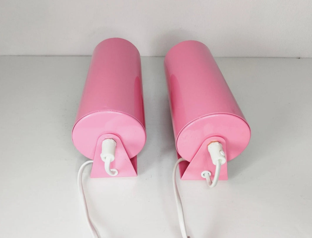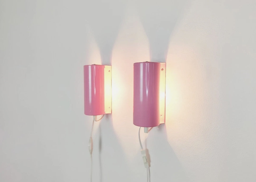 Unikt par av retro rosa vägglampor från IKEA, troligen tillverkade under 1980- eller 1990-talet. Dessa klassiska tubformade lampor är tillverkade helt i metall och kan monteras både vertikalt och horisontellt. Perfekta som sänglampor, läslampor eller som dekorativa vägglampor i vardagsrum, hall eller sovrum.